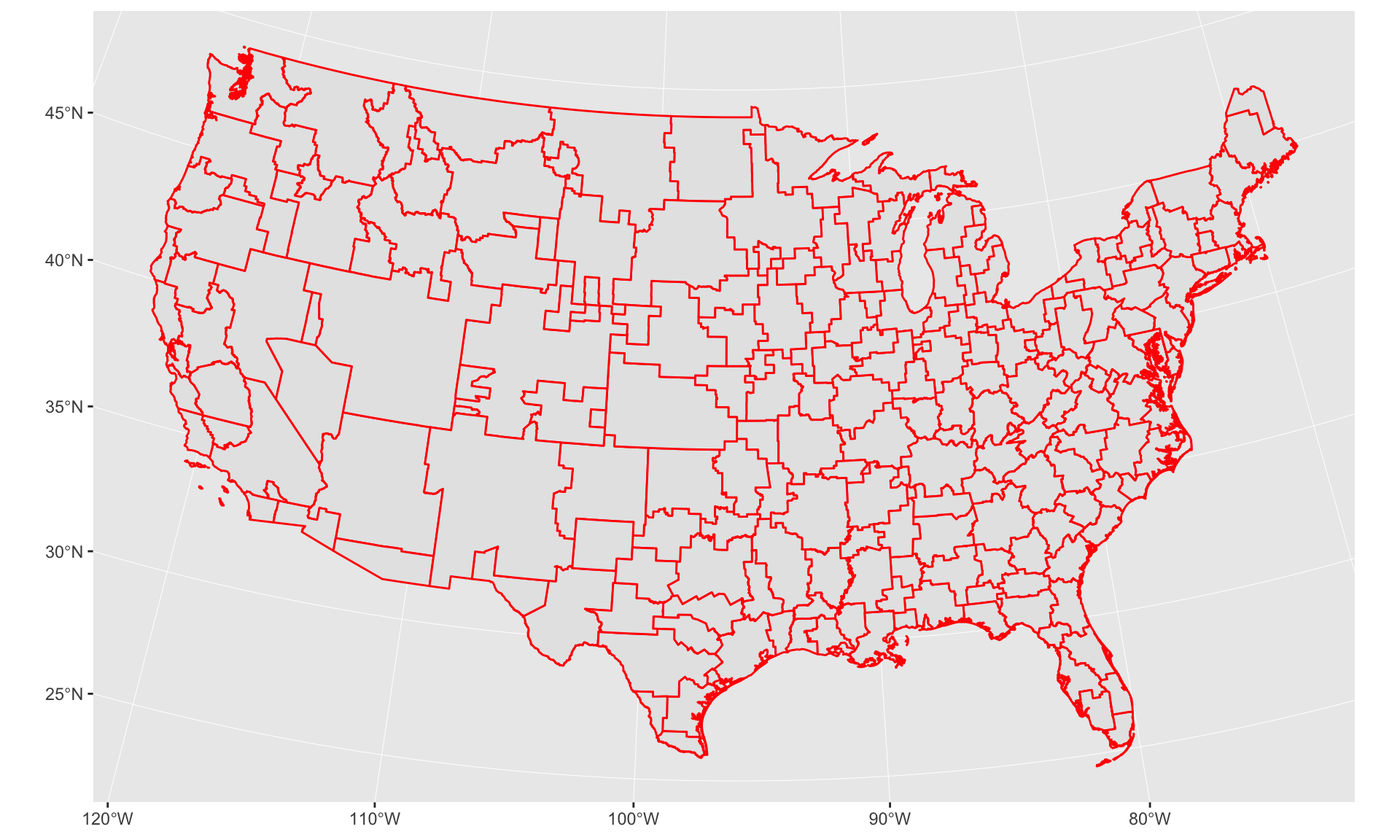 geom_sf(data=states, color="red", fill=NA) +