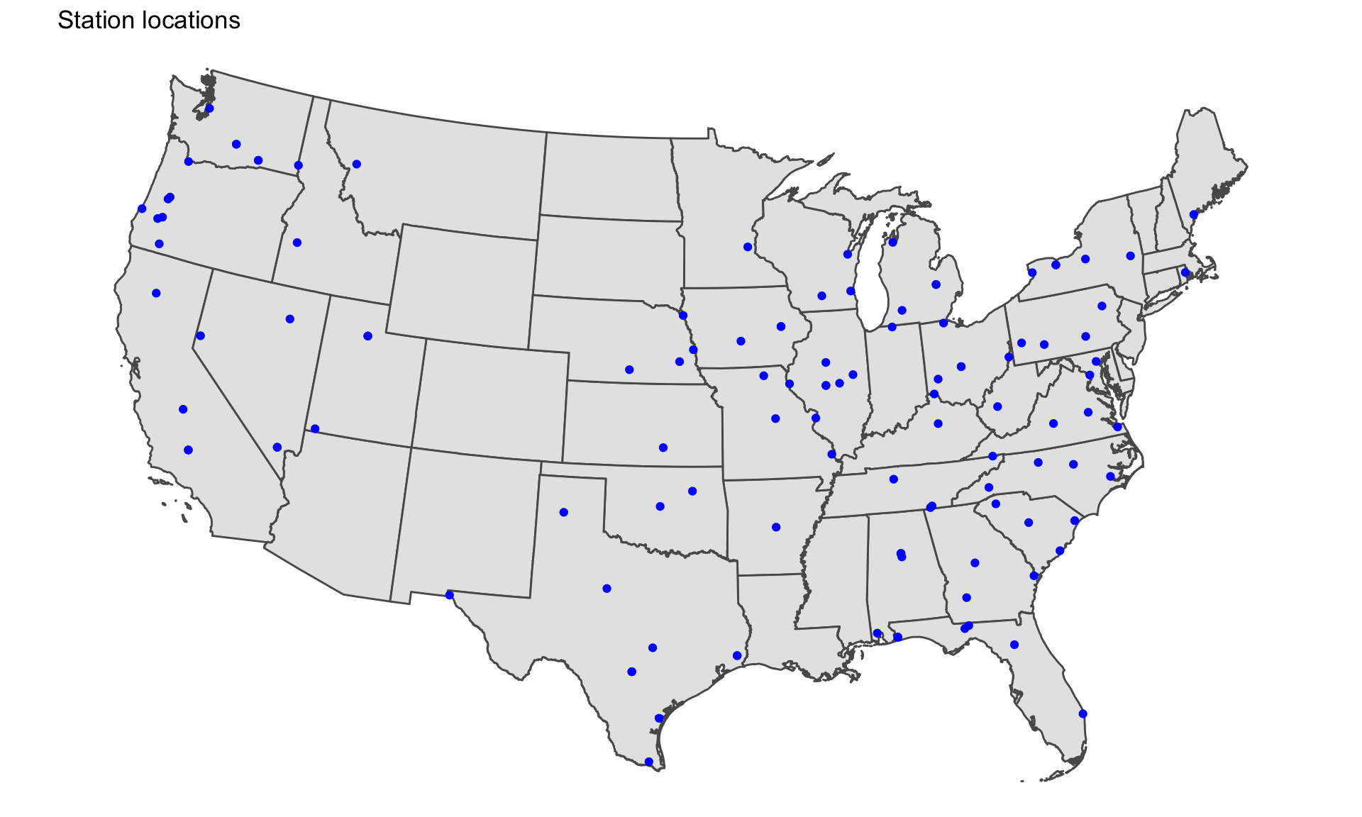 We can map out the station locations quickly using the sf package to visualize latitude and longitude of each one on top of a map of the country downloaded using the tigris package.